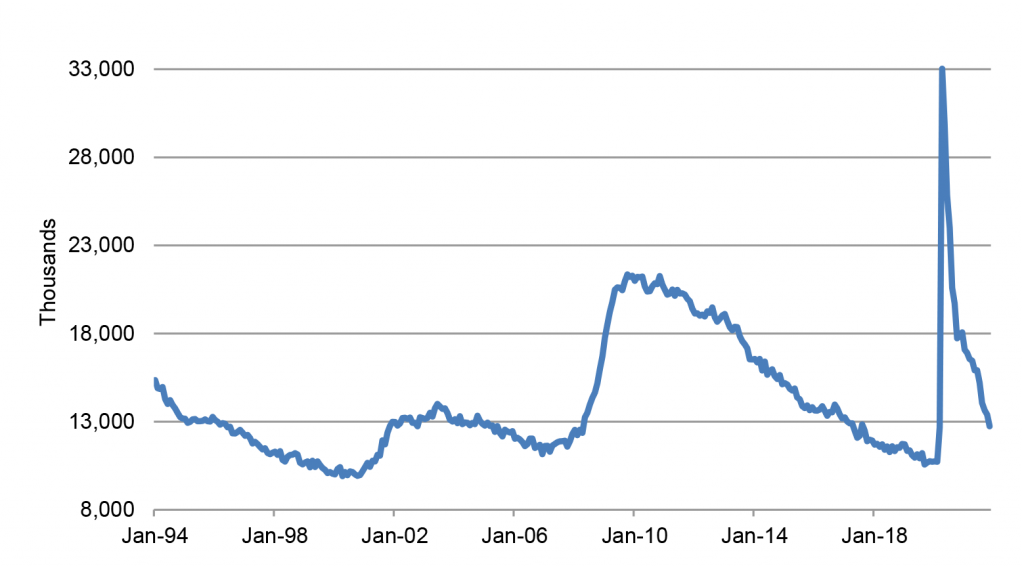 In the household survey results, those who were not employed and failed to actively search for work are considered to be out of the labor force. Of that group, most are quite settled, perhaps retired, raising children, taking care of a relative or friend, or physically unable to work. The household survey asks those not in the labor force more about their status. These questions result in a series titled “Not in the labor force, want a job now.” These people consider themselves ready to work but, for whatever reason, failed to actively look during the most recent survey period. Perhaps they were sick, or had car trouble, or had visitors in town. Or, in normal economic times, they might not have looked simply because they figured nothing was available. That latter explanation seems less broadly applicable in the current environment, when job openings are ubiquitous, but there are still many people who say that they failed to look due to discouragement each month.