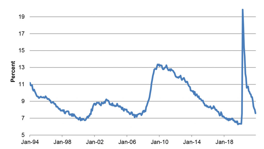 Fed officials set a benchmark last year for reaching full employment. They wanted to see employment and labor force participation return to February 2020 levels. Hitting that target for participation looks increasingly unlikely, as millions of people retired early and many others that left the job market have been slow to return. The unemployment rate has plunged to 4.2% as of last month, close to the FOMC’s estimate of the 4.0% rate consistent with full employment. However, a narrow definition of unemployment alone is not sufficient to fully describe the supply side of the labor market, especially when there is so much uncertainty about how many people may yet return from the sidelines to the job search process.