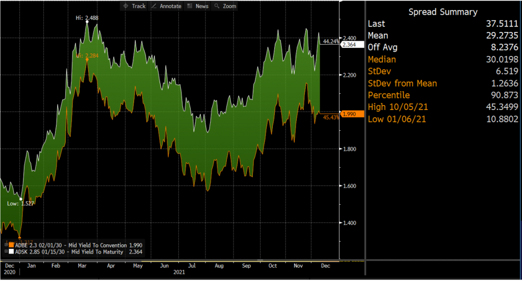 Exhibit 1. ADSK 2.85% 2030 vs ADBE 2.3% 2030 (2021 Year-to-date – g-spread)