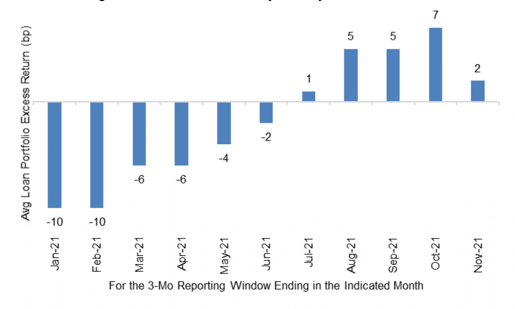 After accounting for managers’ reporting dates, the S&P/LSTA Total Return Index posted returns of 143 bp for the three months ending in November. The average loan portfolio for managers with five or more actively tracked deals had a beta to the index of 1.03, reflecting slightly more risk than the index itself. With that beta, the average portfolio should have gained 148 bp. Since the average portfolio instead gained 150 bp, it delivered 2 bp of excess return.