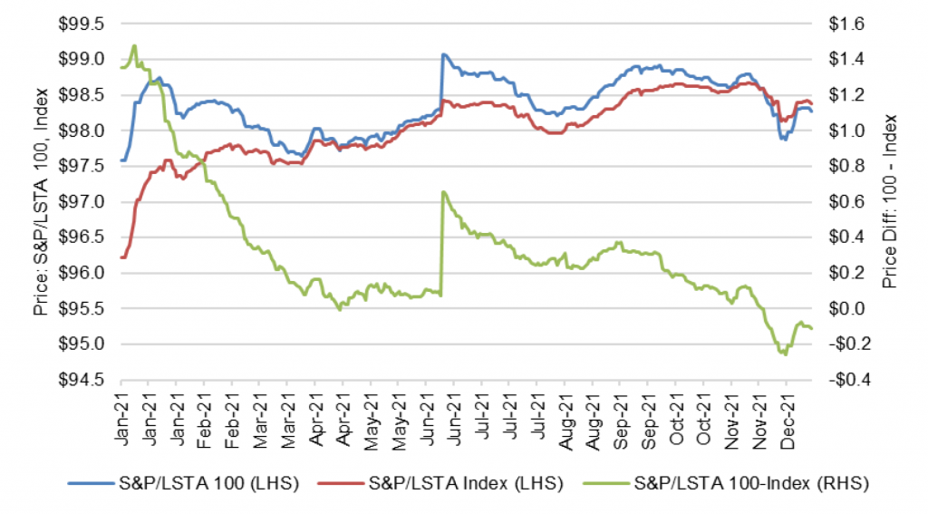 Note: The S&P/LSTA 100 price series shows a large jump from 10 Jun 2021 to 11 Jun 2021 due to the restructuring of a discount loan to Seadrill Partners and replacement of that loan in the index by a loan to United Airlines, the next largest loan in the market.