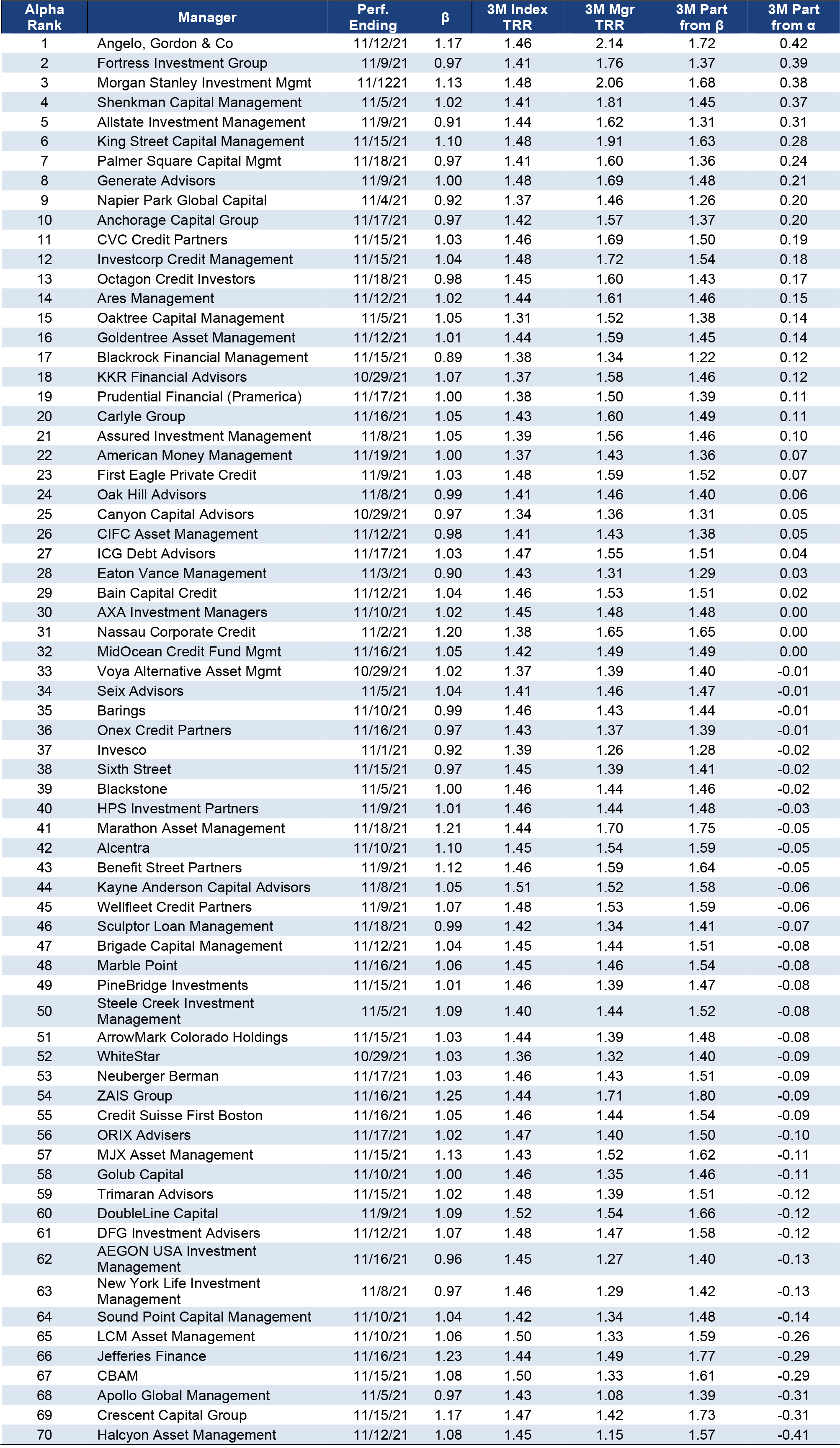 For the three months ending in November, Angelo Gordon, Fortress, Morgan Stanley, Shenkman and Allstate led all larger managers with the highest excess returns. A list of all other managers and their level of excess returns is below (Exhibit 3).