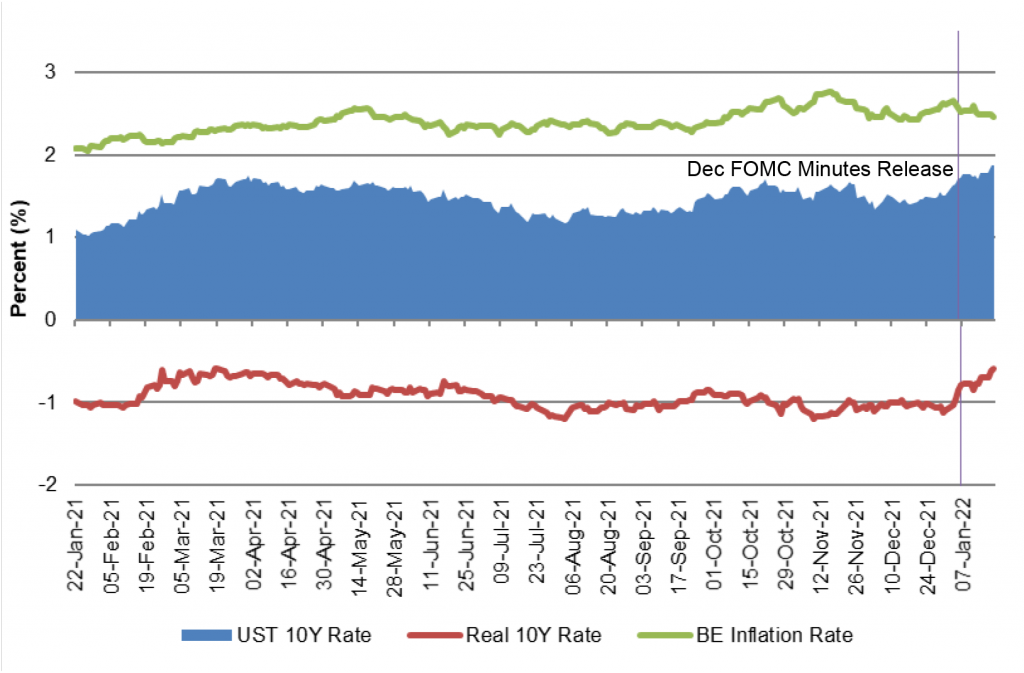The possibility of early portfolio runoff was the big surprise in the December minutes. The Fed had made the tapering schedule clear and had signaled hikes quickly after tapering finished. Portfolio runoff was new. After the last tapering that finished in October 2014, the Fed waited until October 2017 to start letting the portfolio slowly renormalize. The December minutes suggest the Fed is on a much shorter timeline. That is a big deal for real rates.