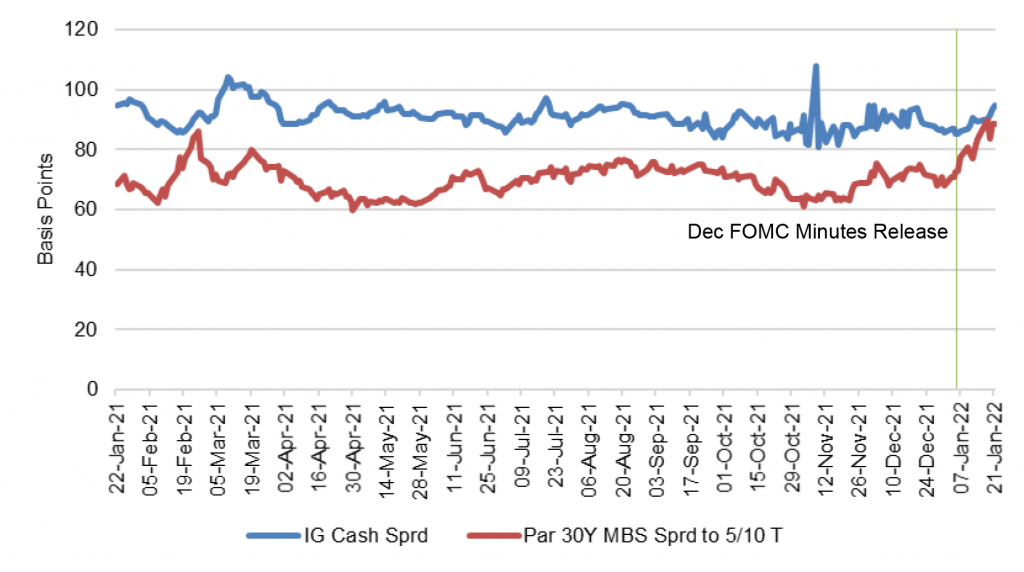 The early January release of minutes from the December FOMC showed the Fed was ready to fight not just inflation but the overhang of liquidity that had swamped real rates. The minutes signaled a quick start to portfolio runoff that could begin to soak up $4.4 trillion in cash in the system from the current round of QE. Real rates have since jumped, inflation expectations declined and spreads on risk assets widened. But it is inflation expectations more than real rates driving risk spreads. Risk spreads almost certainly will go wider as the Fed drives expectations down further, but the damage should be limited.