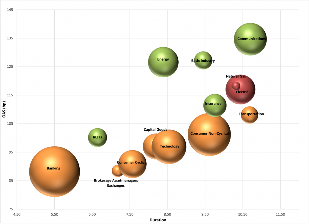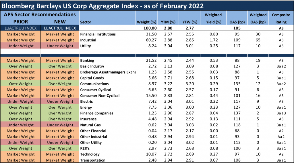Our sector weighting view recommendations remain unchanged for February. The two graphics below provide a summary of how APS expects sectors within the IG Index to perform for the next several months on an excess return basis (total return net of commensurate UST return). These weightings serve as a proxy for how we recommend that portfolio managers should position their holdings relative to the broad IG corporate bond market.