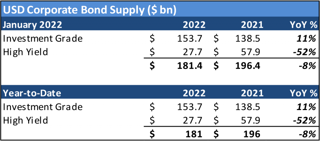 The early rush to price paper in January helped offset the late-month shutdown of the primary market leading up to and immediately following the FOMC. As a result, the $154 billion in IG corporate bond volume for the month exceeded expectations and eclipsed the January 2021 total by 11%. Volume was bolstered by a particularly active post-earnings issuance spree by the US money center banks, as well as earlier activity in the month from a bevy of yankee banks. The big 6 US banks brought almost $20 billion in new debt deals in January alone. Meanwhile, NABAU, UBS, and SOCGEN all brought additional jumbo-sized ($5+ billion) multi-tranche debt launches as well. The high yield market added $28 billion to the corporate total, about half of what they priced in the prior year period.