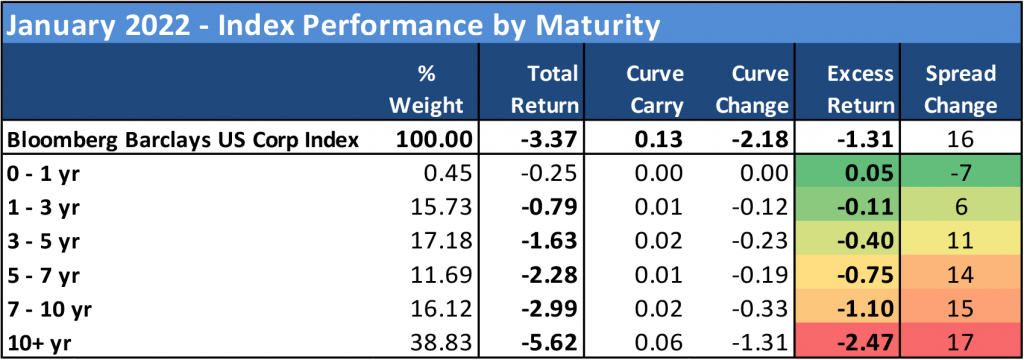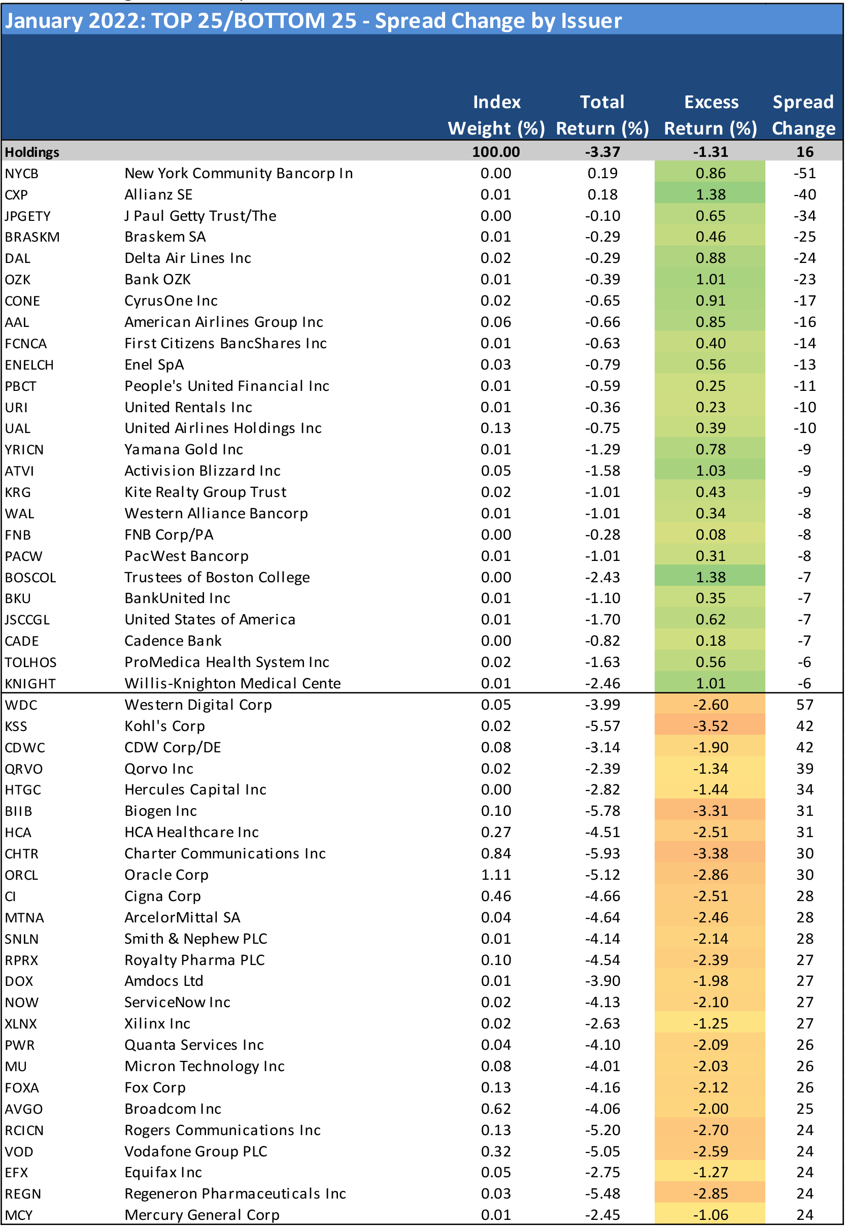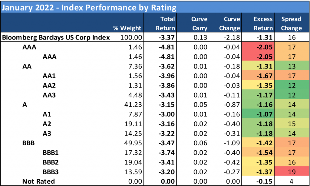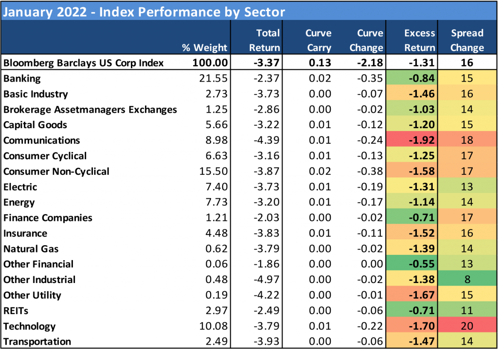 Financials offered the safest haven in the credit sell-off, with 4 of the top 5 performances by sector being recorded by finance companies (-0.71% excess return), REITs (-0.71%), banking (-0.84%), and brokers/asset managers (-1.03%). The steeper yield curve and higher rates projects to benefit financial credits more so than their industrial and utility counterparts. The fifth best sector performance was recorded by energy (-1.14%), which benefitted from the run-up in oil prices amidst ongoing global inflation. Not surprisingly, sectors with longer-dated duration concentrations made up many of the weakest performance in the index in January. TMT credits were particularly hard hit in the sell-off. The bottom 5 performances by sector were recorded by communications (-1.92%), technology (-1.70%), consumer non-cyclical (-1.58%), insurance (-1.52%) and transportation (-1.47%).
