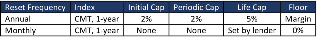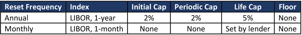 Most floating rate HECMs were indexed to monthly or annual LIBOR, but origination halted in early 2021. Ginnie Mae stopped pooling new LIBOR-indexed loans in March and the FHA stopped insuring new loans in May. The FHA had offered loans that reset monthly and annually (Exhibit 1). The annual reset loans became the dominant product after the FHA stopped permitting fixed-rate loans with a line-of-credit option in 2014. The annual loans include periodic caps that shield the borrower from some interest rate risk, which is more appealing to borrowers that would prefer a fixed-rate loan but also want a line-of-credit. Borrowers face more interest rate risk with monthly loans that do not have periodic caps.