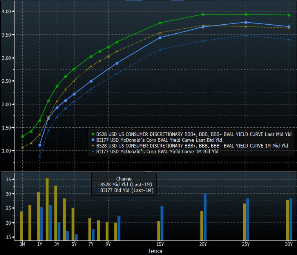 Of all credits in the investment grade universe, McDonald’s (Baa1/BBB+) has among the most revenue exposure to the Russia-Ukraine conflict. The two countries combined contributed approximately 9% of company revenues in fiscal 2021.  The intermediate and back end of MCD’s curve has widened more than the consumer discretionary curve over the past month, but any impact from sanctions imposed is not likely to materially affect credit metrics or margins. If all EBITDA from both countries disappeared completely for a full year, leverage would increase less than one tick. Any widening associated with the conflict makes MCD a better relative value.