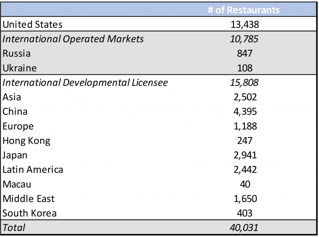 MCD ended the most recent fiscal year with a systemwide restaurant count of 40,031 as seen in Exhibit 2. The combined Russia/Ukraine restaurant count represents 2.4% of MCD’s total restaurants. According to MCD, 84% of Russian restaurants and all of the Ukraine restaurants are company operated.  That said, on a combined basis Russia and Ukraine accounted for 9% of revenues in 2021, but only 2% of systemwide sales.  On an operating income basis, the combined countries only accounted for less than 3% of operating income, as franchised restaurants carry higher operating margins.