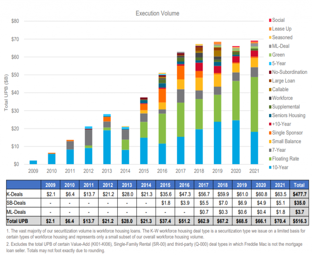 Freddie Mac’s multifamily loan production totaled $70 billion in 2021, with total securitization volume of $80 billion. About 90% of that is securitized through one of the K-deal programs, while around 9% is securitized through the small balance (FRESB) loan program.