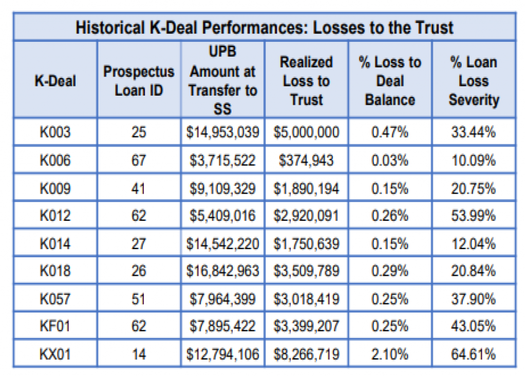 Note: Losses through June 30, 2021. Total losses to B-piece investors have been $30.13 million since inception of the K-deals in 2009. Freddie Mac has not realized any credit losses on their K-deal guarantees.