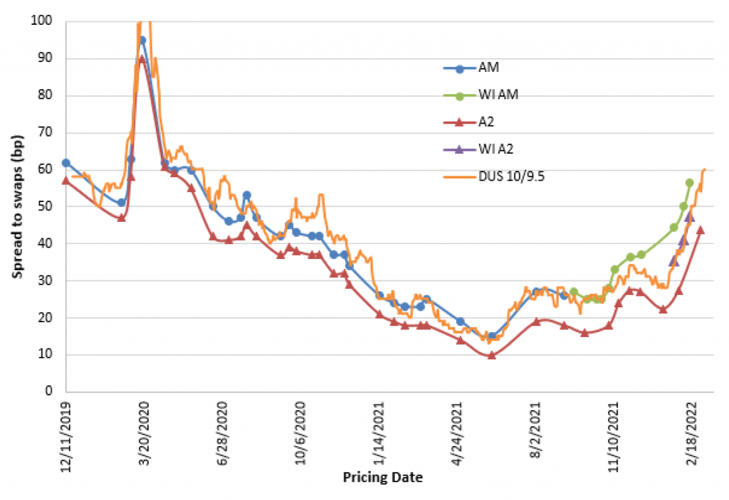 Exhibit 6: Relative spreads of 10-year K-deal AM, A2 classes versus 10/9.5 DUS