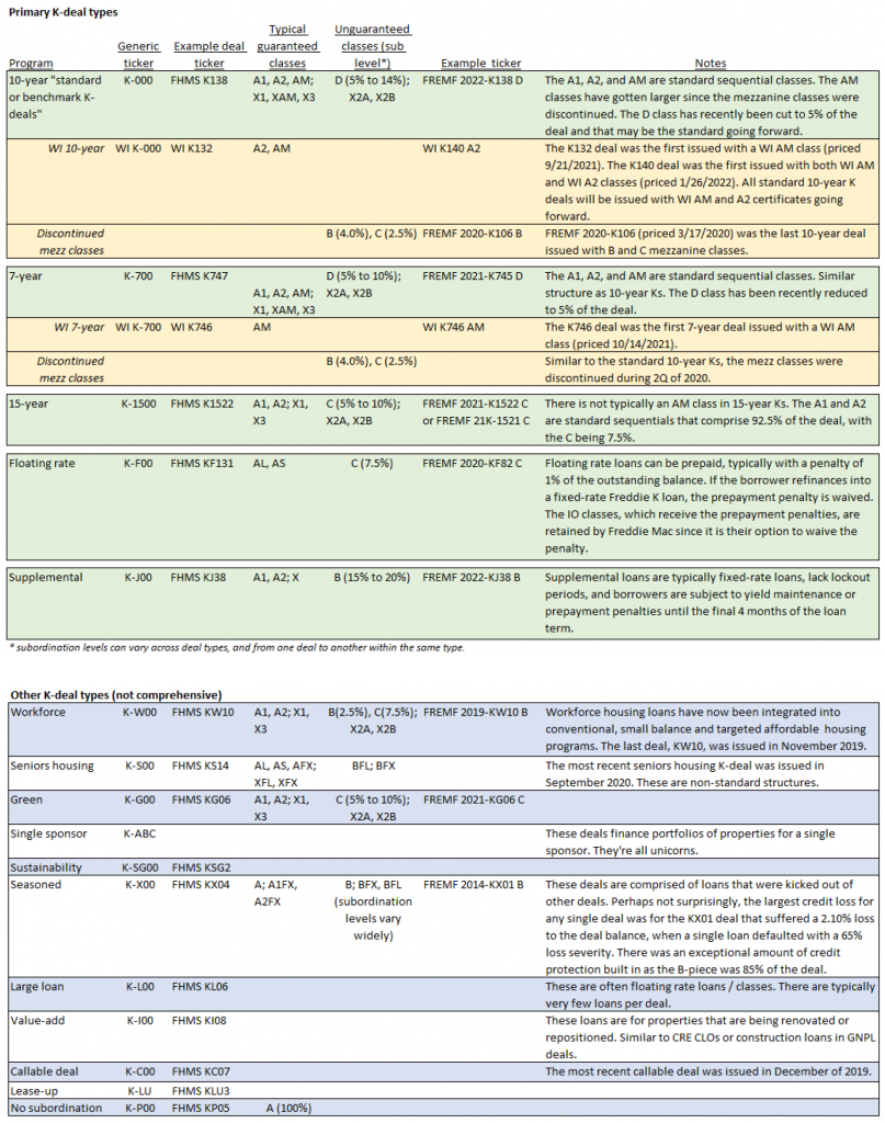 Freddie Mac’s flagship multifamily K-deal program has evolved over the past two years. The elimination of mezzanine classes and launch of the when-issued program have affected deal structure and realigned historical spreads between fixed-rate Ks and DUS. A cheat sheet of K-deal programs highlights these changes and underscores a relative value opportunity for total return accounts that will likely become a persistent feature of fixed-rate 10-year and 7-year K-deals.