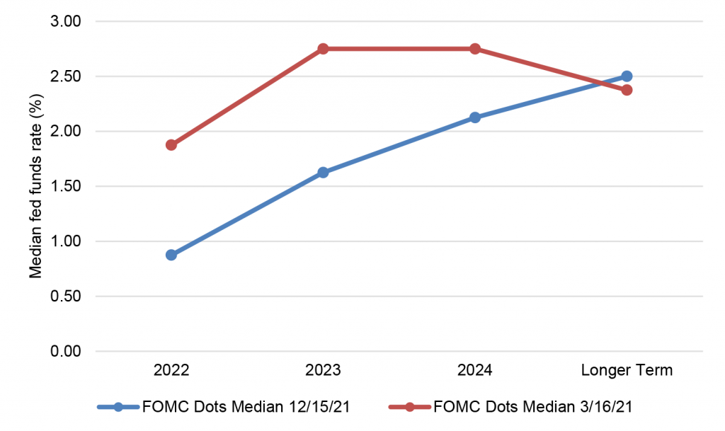 Last Wednesday unveiled a tectonic shift in Fed consensus since December. The median fed funds rate at the end of 2022 jumped by 100 bp, by the end of 2023 by 112.5 bp and by the end of 2024 by 62.5 bp (Exhibit 1). And the median longer-term rate, the goldilocks rate that covers the cost of inflation and leaves the supply and demand for money in balance, fell 12.5 bp