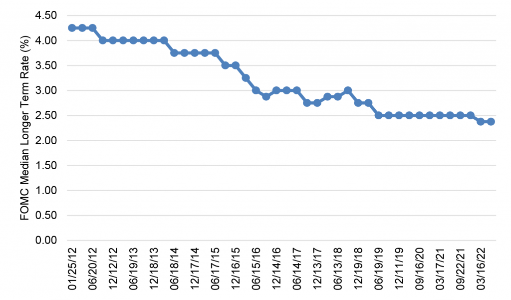 Exhibit 2: The FOMC’s median longer-term rate has dropped for 10 years