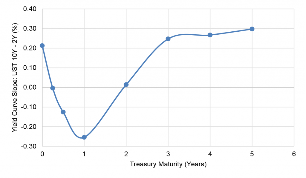 Exhibit 3: Forward rates imply the 2s10s curve will invert over the next year