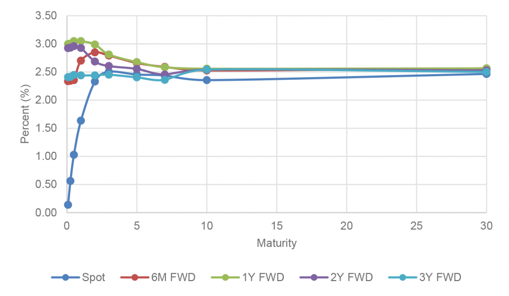 Exhibit 1: Forward rates imply one of the steepest 2s10s inversions since 1982
