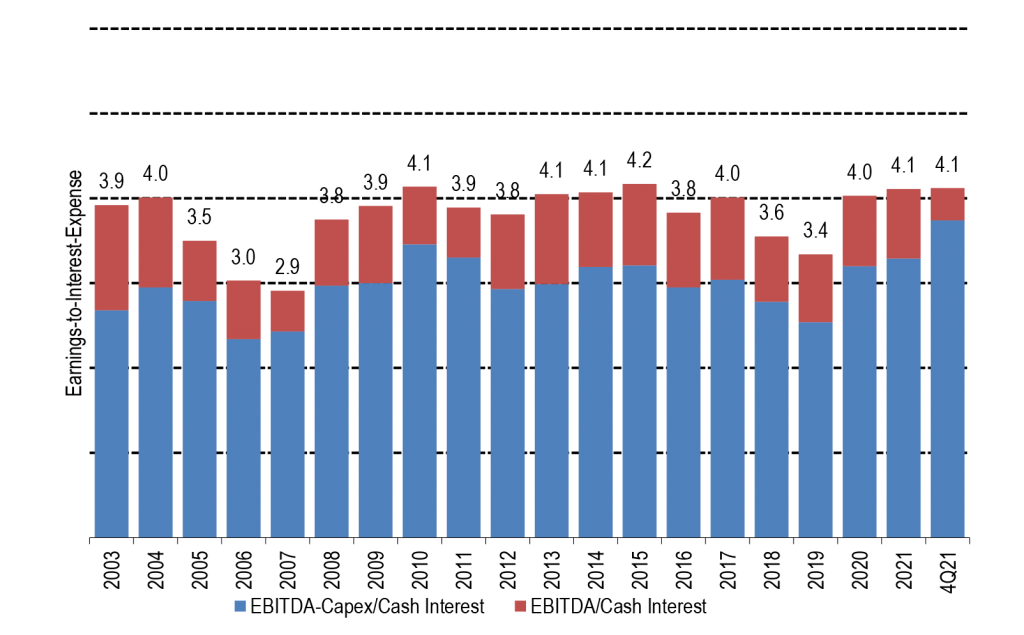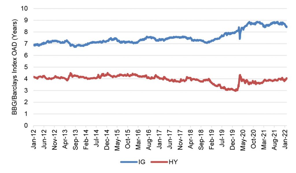 Despite a broadly positive picture, not all corporate balance sheets are equal when it comes to interest rate exposure. Investment grade companies have generally taken advantage of markets in 2020 and 2021 to issue debt with longer maturities and lock in lower rates. The duration of the Bloomberg/Barclays $6.5 trillion investment grade corporate index, for example, has gone from 7.0 years at the start of 2019 to nearly 8.5 years lately, insulating these issuers further from the impact of rising rates (Exhibit 4). The duration of the Bloomberg/Barclays $1.5 trillion high yield debt index, on the other hand, has roughly stayed the same at around 4.0 years, suggesting more leveraged issuers either showed less initiative to extend maturity or, more realistically, could not issue at longer maturities in the high yield market. High yield issuers have the same exposure to rising rates that they did in 2019, but the risk of rising rates—at least over the next few years—is higher.