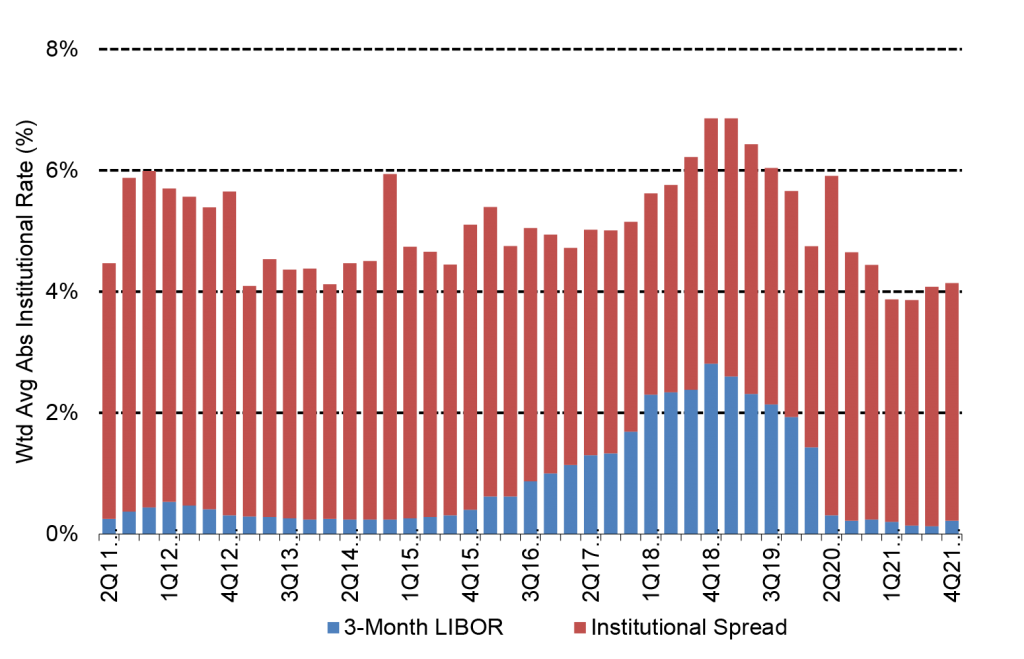 The sector of credit most vulnerable to rising rates, however, is the $1.35 trillion market in leveraged loans. Almost all loans float off 1- or 3-month LIBOR or, increasingly, SOFR. Forward rates anticipate 3-month LIBOR will rise over the next year from late 2021 levels of 0.22% to more than 3.00%. That would push the average coupon in the leveraged loan market from its late 2021 mark of 4.14% to 6.85% (Exhibit 5). In other words, all else equal, the average issuer would see interest rate expense rise 65% or more.