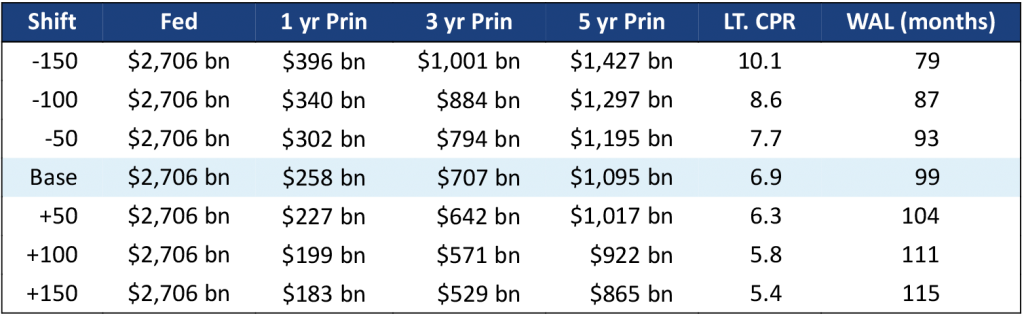 Interest rates and mortgages rates have moved much higher this year. MBS prepayment speeds, including the pools owned by the Fed, are going to slow. This means the Fed’s MBS holdings are going to shrink slowly if it relies only on scheduled payments and prepayments (Exhibit 1). The data in the table assumes that the Fed begins runoff immediately and does not cap runoff. However, in the base case runoff averages only $21.5 billion in the first year and will likely not exceed $25 billion in any month. After five years the portfolio will have returned $1.1 trillion, and the Fed will still own $1.6 trillion MBS. That is a larger amount than it owned in early 2020, before starting QE4.