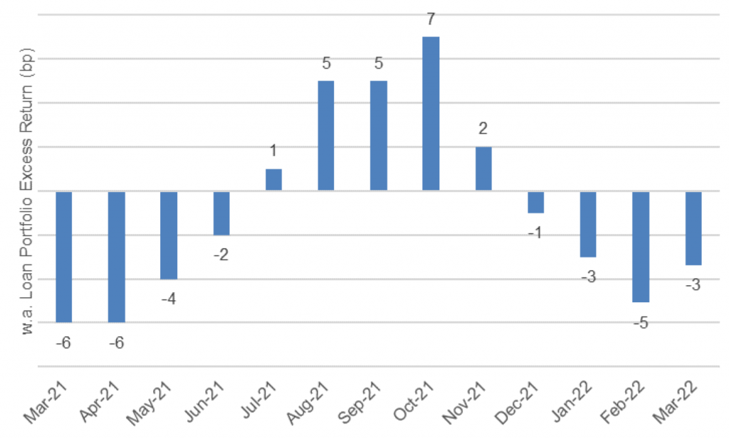 Note: The data shows the average excess return relative to the S&P/LSTA Total Return Index for 75 managers with five or more active deals. The data cover performance for the three monthly reporting periods ending on or before March 22, 2022.