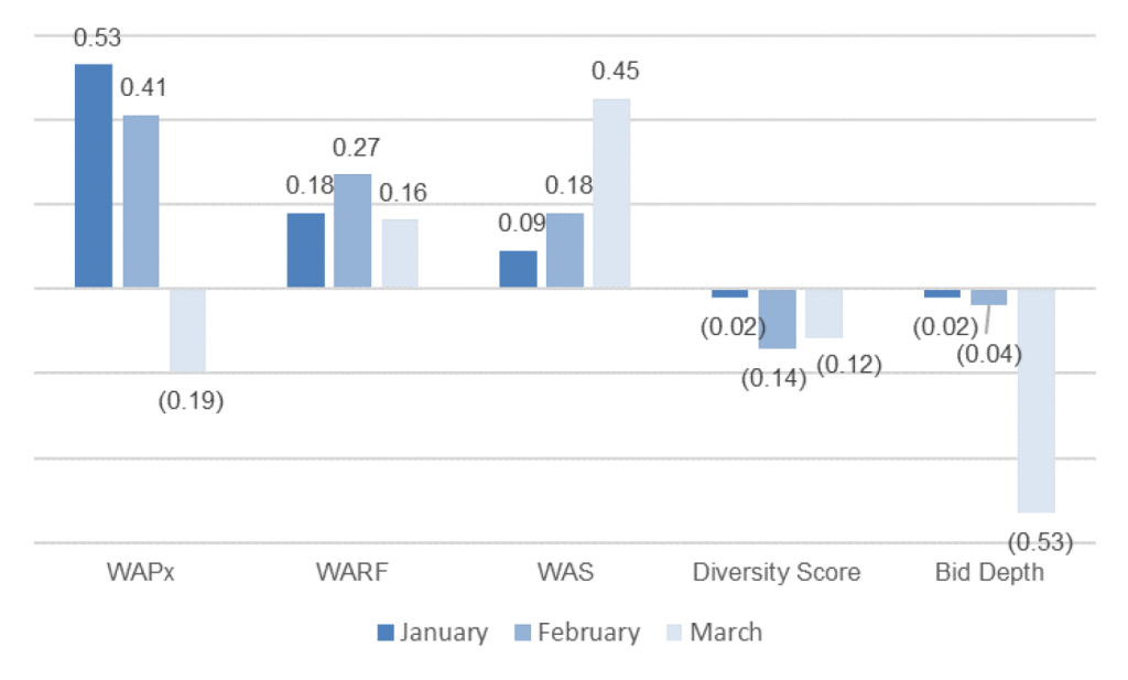 After accounting for managers’ reporting dates, the S&P/LSTA Total Return Index posted returns of -42 bp for the three monthly reporting periods ending in March. The average loan portfolio for managers with five or more actively tracked deals had a beta to the index of 1.02, reflecting slightly more risk than the index itself although down from a beta of 1.03 earlier this year. With that beta, the average portfolio should have returned -43 bp. Since the average portfolio instead lost 46 bp, it ended up with a rounded 3 bp loss.