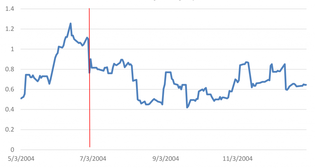 Exhibit 1: 6-month-ahead fed funds futures tightening expectations: 2004