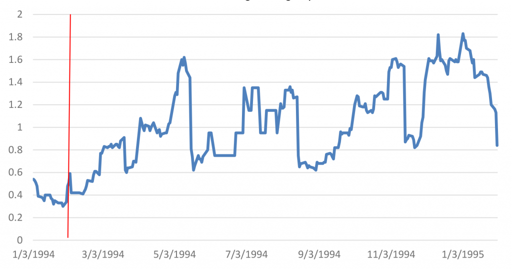 Exhibit 2: 6-Month-ahead fed funds futures tightening expectations: 1994