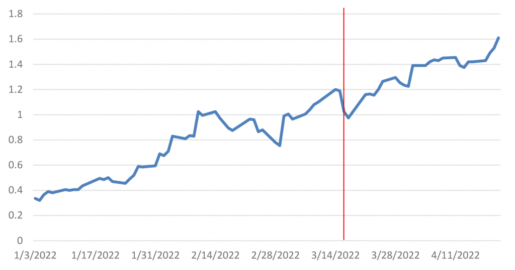 There has also been a rapid evolution in the expected peak fed funds rate for the upcoming cycle so far this year. The September 2023 3-month SOFR futures contract has provided a decent proxy for where investors expect the rate hike cycle to top out. Six weeks ago, on March 7, the contract yielded 1.89%. It has soared by over 140 bp since then and was trading on April 21 at just over 3.30%.