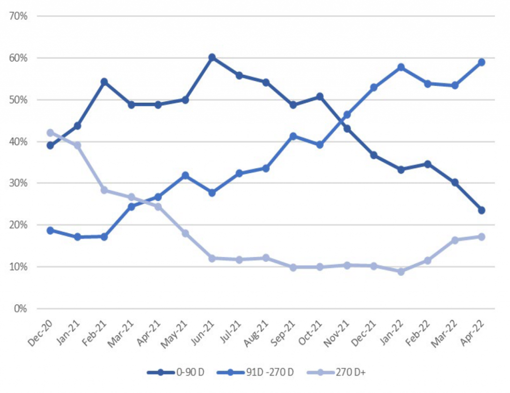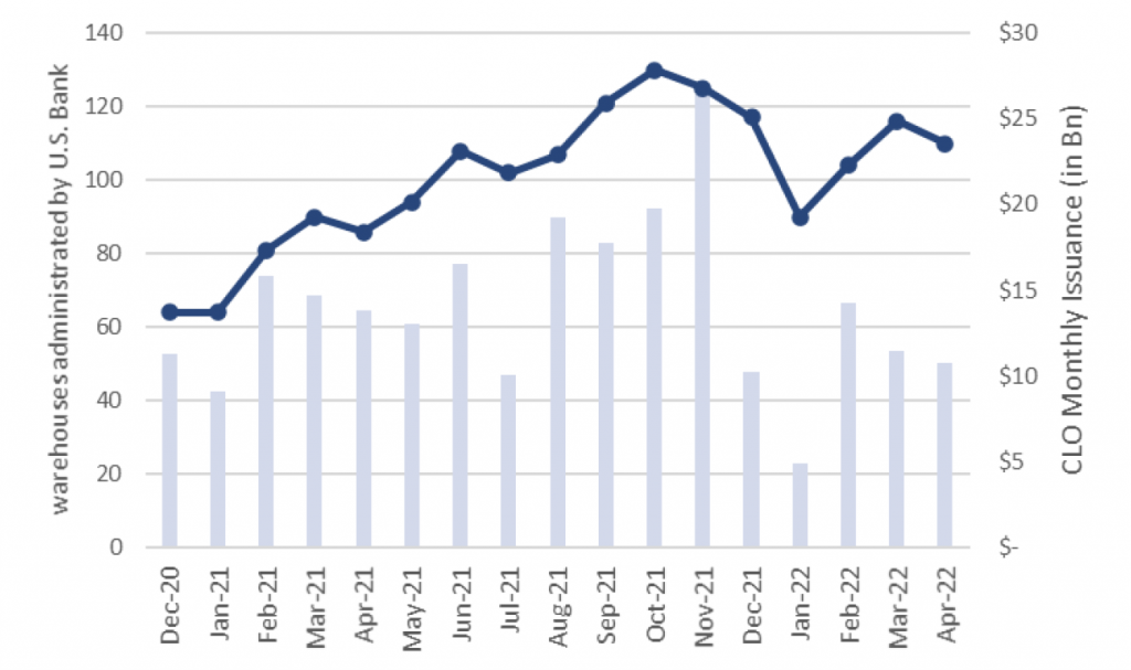 Warehouse financing for the CLO market continues to signal that issuance could cool off quickly later this year, although a healthy supply of deals is still in the pipeline. The number of outstanding warehouse lines has bounced up and down since January but still stands only a bit below last year’s peak. The increasing average age of outstanding lines nevertheless suggests that once the current pipeline clears through the back half of 2022, issuance should drop sharply.