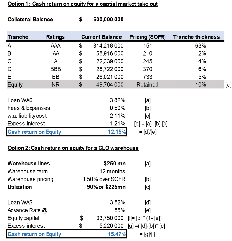 Of these possible explanations, the appeal of warehouse financing over capital markets for now is clear. The funding cost for a new issue BSL CLO has increased from an average of 180 bp in the beginning of this year to 210 bp for some recently priced deals. While CLO warehouses are typically lower levered than CLO deals—5x to 7x leverage in warehouse compared to 9x to 10x leverage through a CLO—an average of low- to mid-100 bp pricing in warehouses offer better economics to most CLO managers. A hypothetical example suggests warehouse financing could offer better cash flow return on equity (Exhibit 3). Of course, warehouse facilities are heavily negotiated between lenders and managers, and the economic impact on equity will be very sensitive to the advance rate, pricing, and fees inputs.