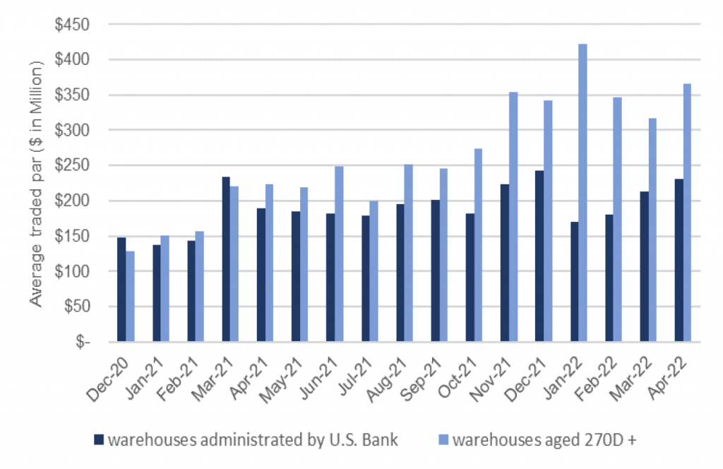 In addition to age extension, warehouse traded par, the aggregate dollar amount of loans in warehouses, also points to a current backlog in CLO warehouses. The average traded par in warehouses aged nine months or older has been much higher than the average traded par in all warehouses under US Bank’s administration (Exhibit 4).