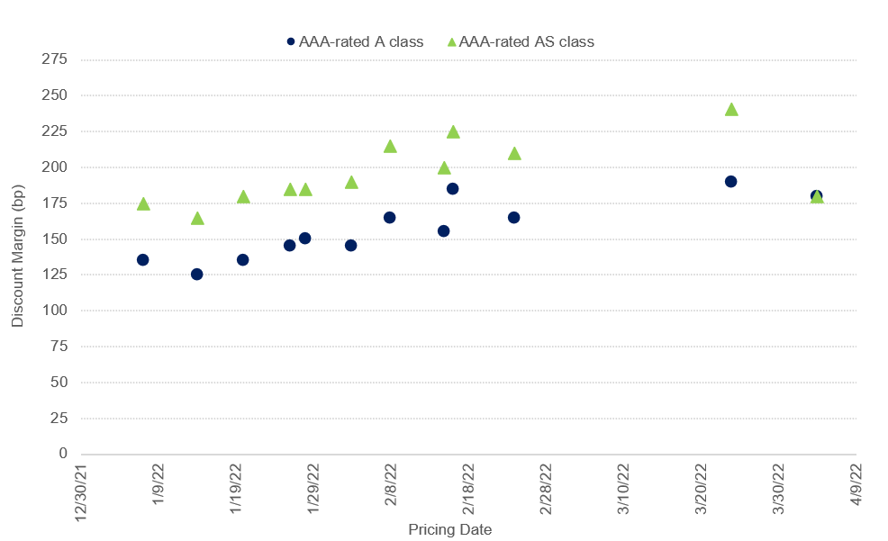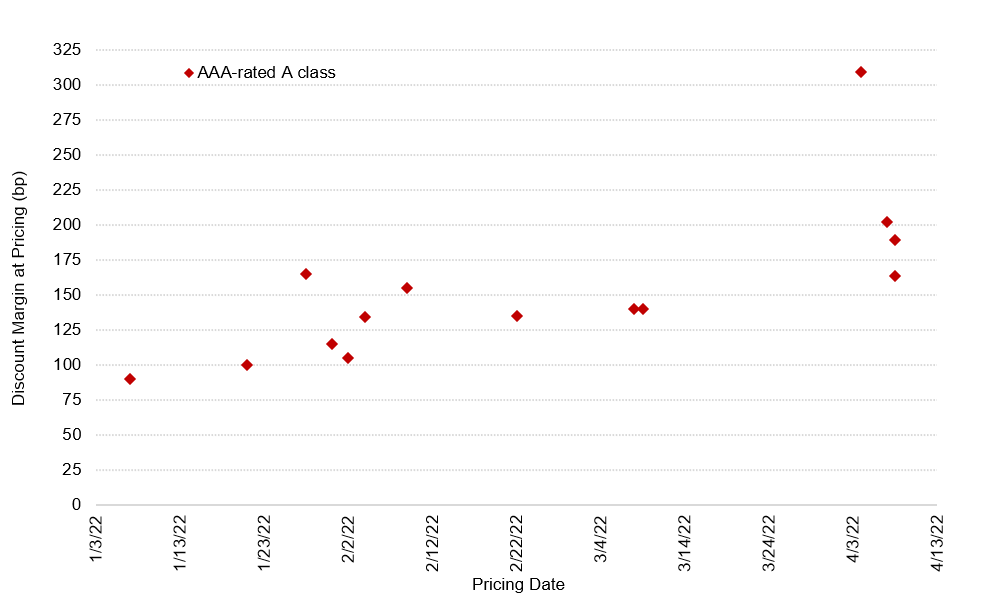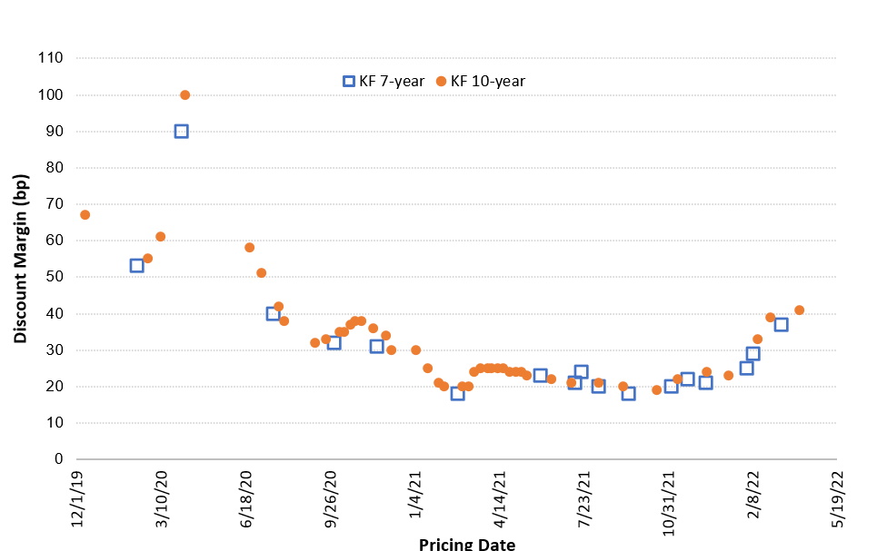 Discount margins on new issue KF deals maintained a low of about 20 bp through most of 2021 and began rising late in the fourth quarter. So far, spreads have steadily widened to about 40 bp in 2022 with another deal expected to price the first week of May. These spreads are still below their pre-pandemic levels of 50 to 60 bp.
