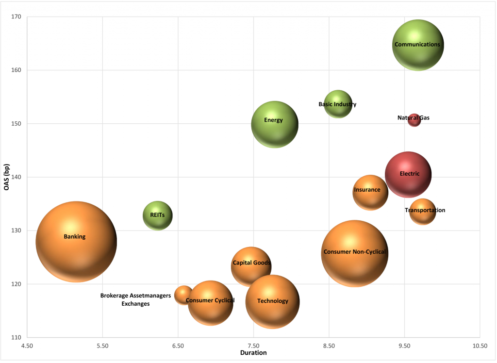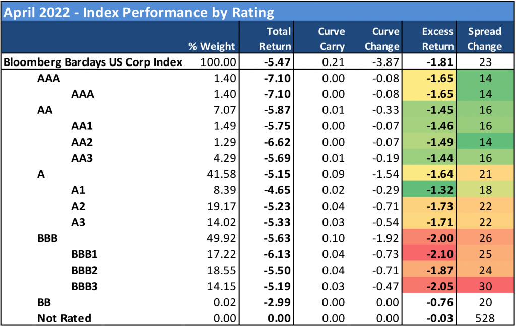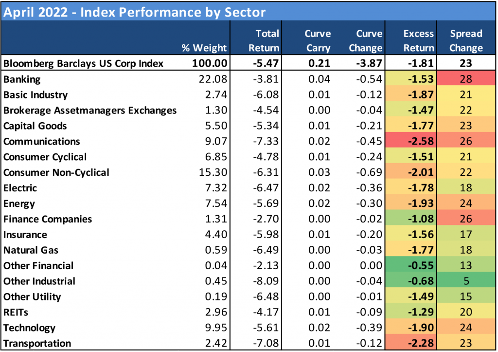It was extremely difficult to find winners amidst the April selloff in credit. Investors sought out the safety of the highest rated credits within the Index, or at least that’s where credits were less impacted by the move wider in spreads. By sector, the least bad performances were delivered by finance companies (-1.08 excess return)—aided by the recovery in aircraft lessors AER and AL—REITs (-1.29%), brokers/asset managers (-1.47%), consumer cyclical (-1.51%) and banking (-1.53%). The single worst performance in the index was delivered by the communications sector (-2.58%) as longer durations were hit hardest and recent new issue in the segment may have weighed heavily on secondaries. Other bottom performers included transportation (-2.28%), consumer non-cyclical (-2.01%), energy (-1.93%) and technology (-1.90%).