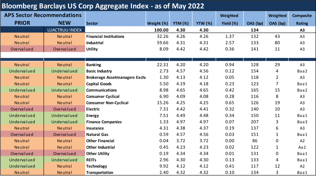 The relative value view on technology shifts to neutral from undervalued this month, as rate hikes will likely continue causing extreme volatility for tech stocks and putting pressure on spreads. We are not moving to an overvalued view, as balance sheets remain largely in good shape. The two graphics below provide a summary of how APS expects sectors within the IG Index to perform for the next several months on an excess return basis (total return net of commensurate UST return). These suggestions serve as a proxy for how we recommend that portfolio managers should position their holdings relative to the broad IG corporate bond market.