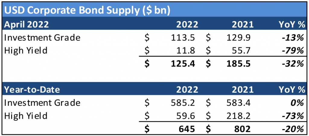 The investment grade new issue calendar moderately exceeded expectations during April, even as several deals were delayed or shelved during highly turbulent sessions toward the close of the month. In total the IG new issue market produced $113.5 billion in total volume on estimates in the $95 to 100 billion range for the month. It was a modest year-over-year decline in volume, and year-to-date issuance now stands almost perfectly flat with the first four months of calendar 2021. There were several jumbo debt deals throughout April including double-digit launches from Amazon ($12.75 billion) and Bank of America ($10.75 billion). The high yield market added just $11.8 billion in additional corporate volume and continues to operate in limited capacity amidst heightened concerns on both rates and credit. May traditionally represents a busy month for the primary calendar, as issuers typically seek to issue ahead of the slower summer months. Estimates heading into the month are for $125 to 150 billion in total volume.