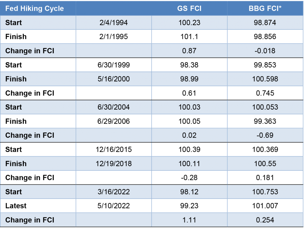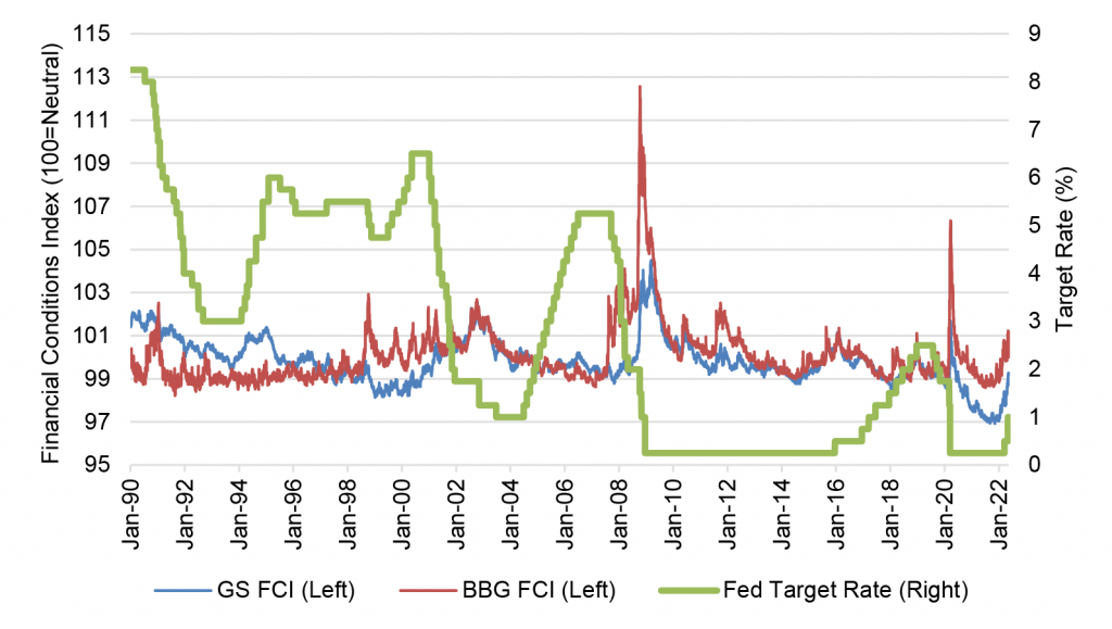 Note: Bloomberg FCI adjusted to have a base of 100 to make it comparable to the Goldman Sachs FCI.