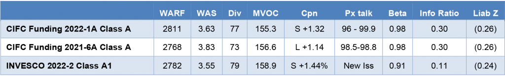 Some recent flows highlight the gap between secondary and primary markets. CIFC Funding 2022-1A Class A appeared on a May 3 bid list offered at a discount margin of SOFR + 162 bp. CIFC is a relatively liquid platform with $25 billion in AUM, and it is a programmatic issuer with four deals closed year-to-date with an aggregate new issue volume of $1.9 billion. Amherst Pierpont analysis of past CIFC new issues indicates its debt usually trades 0.26 standard deviations tighter than its peers. Another CIFC LIBOR-indexed bond, CIFC Funding 2021-6A Class A, traded in secondary on May 6 with price talk of $98.5 to $98.8, implying a SOFR-based discount margin around 160 bp. But on May 9, Invesco 2022-2 Class A1 priced at a discount margin of SOFR + 144 bp. Invesco also is a relatively liquid platform with $6.2 billion in AUM, and this is the second deal priced with year-to-date new issue volume of $1 billion. Amherst Pierpont analysis of past Invesco new issues shows its debt prices on average 0.24 standard deviations tighter than peers—very close to CIFC. A high-level loan attributes comparison across the CIFC and Invesco deals along with APS CLO manager model outputs show comparable risk (Exhibit 3).