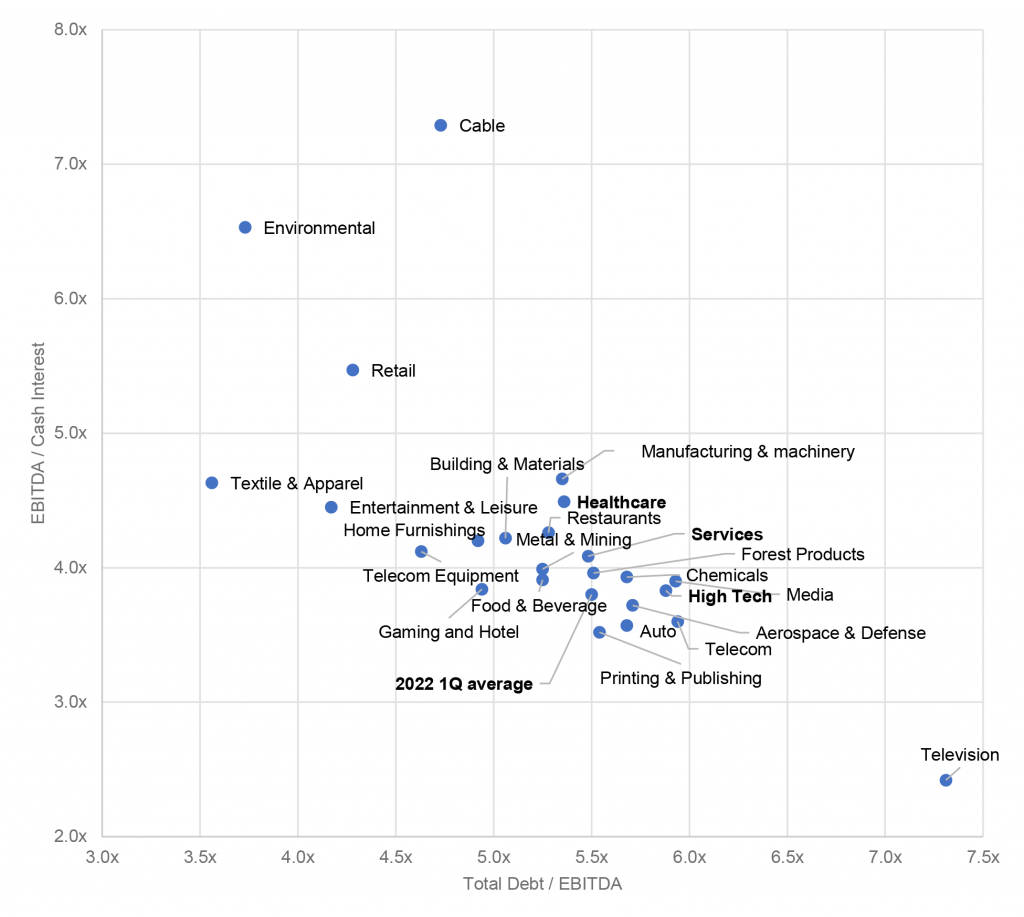 Based on the trailing 12-month data from S&P, debt-to-EBITDA in new loans across different industries mainly ranged between 4.5x to 6.0x while EBITDA-to-interest-expense ranged between 3.8x to 4.5x (Exhibit 1). Television, cable and environmental are outliers in terms of leverage and interest coverage. It is worth noting that the average interest coverage for highly leveraged loans in the first quarter of 2022 is already below many industries’ trailing 12-month average.