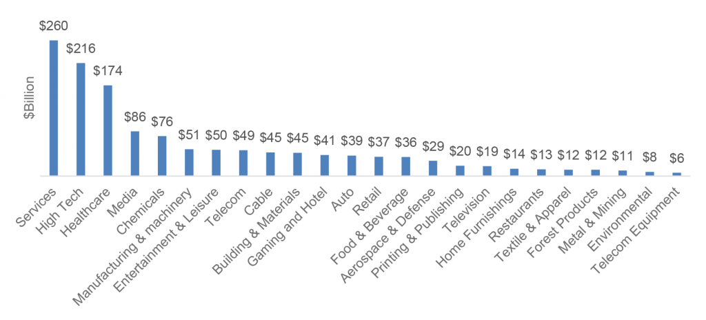 CLO and broad investor exposure to these industries varies substantially across the $1.35 trillion loan market with services, high tech and healthcare the largest exposures (Exhibit 2). Among these three, high tech has the most leverage followed by services and then healthcare. Among the next three exposures, media has the highest leverage of any large exposure with chemicals next and manufacturing slightly more leveraged than healthcare.