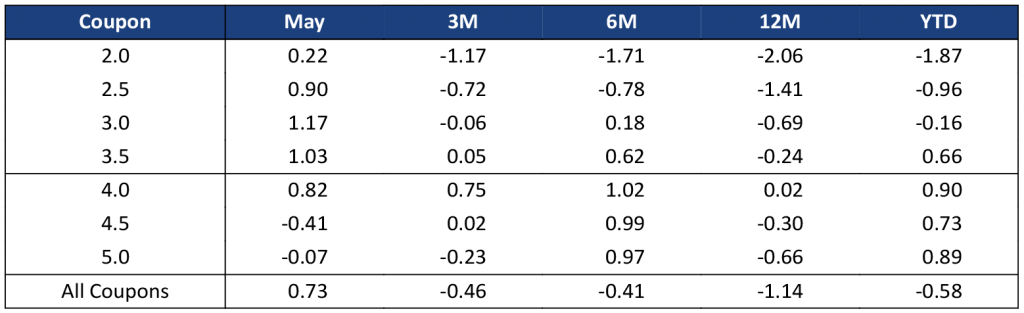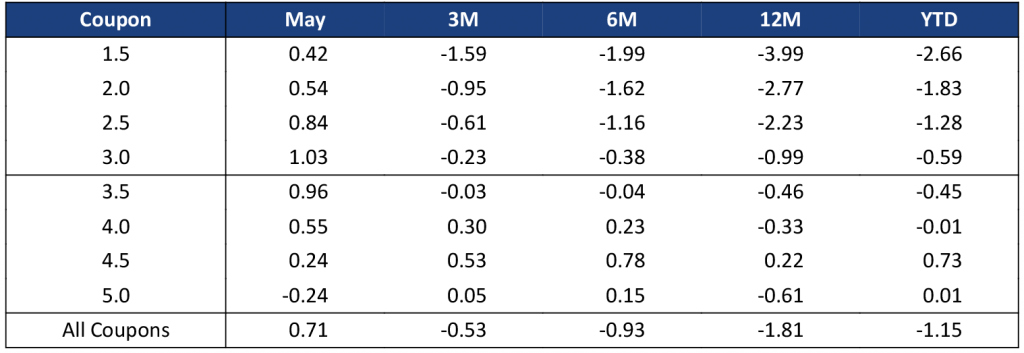 Ginnie Mae also posted positive excess returns for most coupons in May. Bank demand for Ginnie Mae MBS is increasing since the better capital treatment helps banks reduce risk-weighted assets and improve liquidity coverage ratios. An FHA official mentioned in May that there are daily discussions about lowering mortgage insurance premiums. This should not have much effect on most outstanding pools since they are generally well out-of-the-money to refinance. However, 30-year 4.5% and higher coupon pools are priced above par and would be hurt if premiums drop and prepayment speeds increase, which may explain the underperformance in those coupons.
