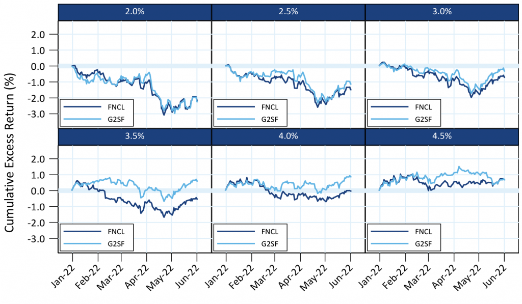 Excess returns for conventional 30-year 3.5% and lower coupons—before accounting for special dollar rolls—have been negative throughout 2022 but turned positive in May. Many investors had been moving up-in-coupon as spreads widened and rates increased because higher coupon pools have less spread exposure than lower coupon pools. The 30-year 4.0% and 4.5% coupons generally outperformed because of this. Supply of those coupon pools has been light since mortgage origination often takes months to ramp up after a big rate move. In May, the best performance was in 3.0%s and 3.5%s, the former of which looked like the most undervalued part of the stack to start the month. Lower coupons also outperformed hedges this month, likely because money managers started covering their underweights in those coupons.