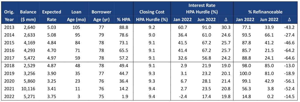 The table shows the balance, average expected rate used to determine principal limits at origination, average loan age, average borrower age, and cumulative HPA. The HPA percentage needs be high enough to pass the closing cost test, which is split into two pieces. The “Closing Cost HPA Hurdle” shows how much HPA is necessary to pass the closing cost test assuming interest rates have not changed. The “Interest Rate HPA Hurdle” section shows how much additional HPA is needed to pass the test when interest rates are higher than when a loan was originated. The cumulative HPA for a loan needs to exceed the sum of the two hurdles for a loan to allowed to refinance.