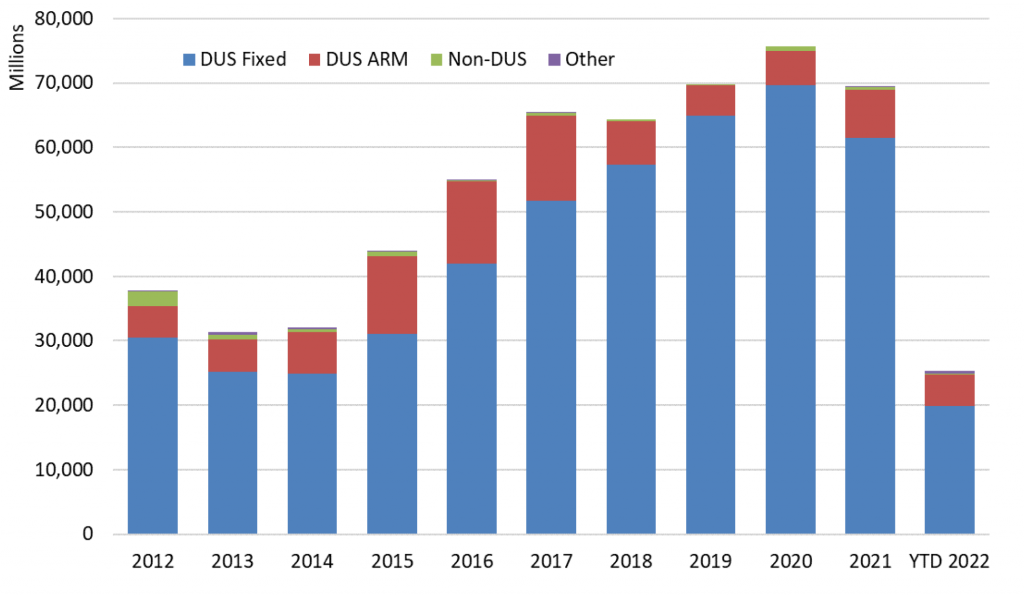 Commercial real estate transaction volumes have slowed, and multifamily properties are no exception. Fannie Mae DUS issuance is $20 billion year-to-date through May, with total issuance of $25 billion. Agency multifamily issuance is traditionally a bit backloaded in the fourth quarter, but it is unlikely to accelerate much with the Fed in a hiking cycle through year-end. The multifamily loan purchase caps are $78 billion for each enterprise for 2022. At the current rate, projected DUS issuance for 2022 would be $48 billion; Fannie’s total multifamily issuance would be $60 billion, or 23% below the $78 billion cap.