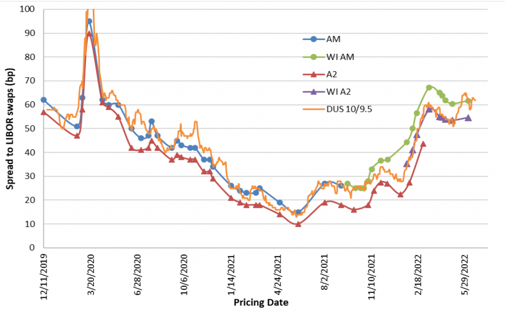 Spreads across most securitized products market have widened against a backdrop of volatile rates, high inflation and recession fears. Agency CMBS spreads, with their ‘AAA’ rating and guarantees, have only modestly moved higher as issuance has declined (Exhibit 2). Freddie Mac K-deal spreads at issue widened out early in the year, peaked in mid-March, then tightened and have held those levels. Part of the widening was possibly due to the integration and expansion of the WI program into the regular issuance cycle. Some investors who had previously backed away from buying WI certificates have gradually gained approval or become more comfortable with the product, and have ramped up their participation. This has arguably contributed to WI A2 spreads remaining tight while DUS 10/9.5 spreads have widened by 10 bp to 12 bp since early May. This widening puts 10/9.5 DUS back in-line with the AM as opposed to the A2 classes of Freddie K deals, which is where they tended to historically trade prior to the introduction of the WI program in the second half of 2021.