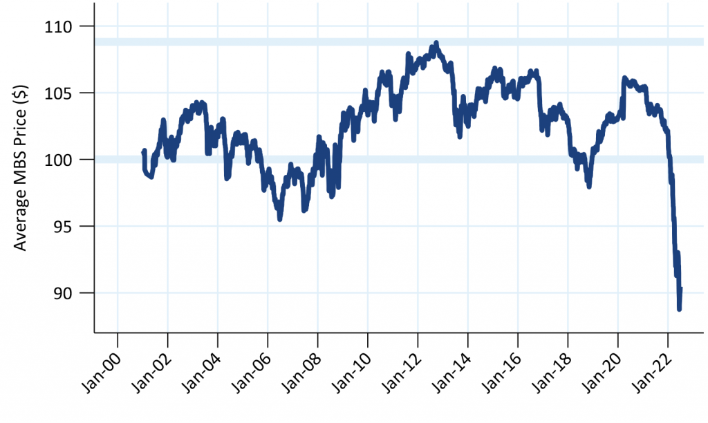The average agency MBS pool traded below $90-00 in June, a sharp drop from the start of the year (Exhibit 1). Since the start of 2001, the average MBS never traded below $95-00, and that was before the 2008 financial crisis. The MBS market may never have traded this far below par. Furthermore, more than 95% of the market is trading at a discount to par. This means that prepayments due to rate or term refinancing should nearly vanish. New loan origination should be dominated by loans for home purchases and possibly some cash-out refinancing.