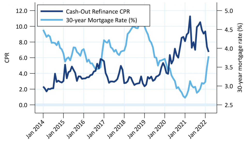 Cash-out refinance speeds estimated comparing cash-out issuance volume to outstanding pool balance.