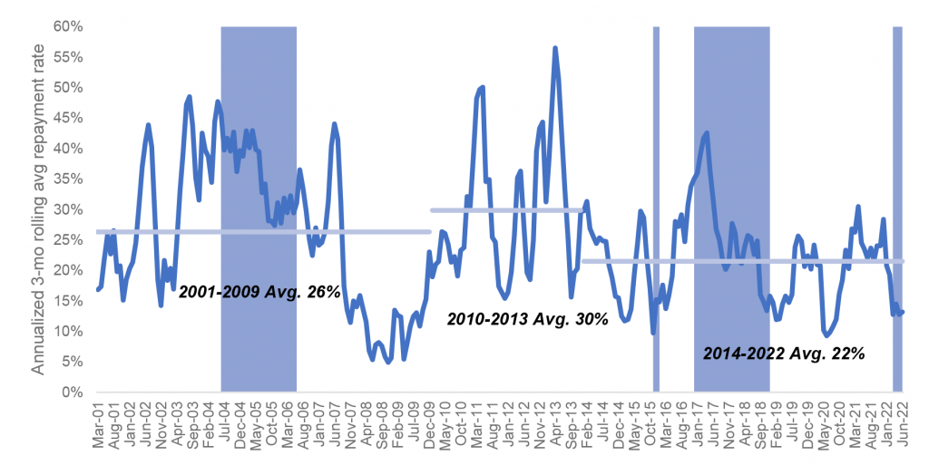 Note: the shaded area represents the Fed rate hike period.  Monthly repayment rate = sum of all repayments in the month divided by the outstanding loans in the index.  Annualized monthly rate = 1- (1- month repayment rate)^12.