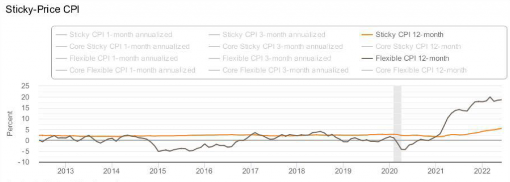 Moving forward to this year, the Flexible-Price CPI gauge has remained extremely high (18.7% as of June), due to a significant degree to the surge in gasoline prices. However, the more troubling development is that the Sticky-Price CPI measure began to take off late last year and has accelerated sharply in the first half of 2022, reaching 5.6% in June.